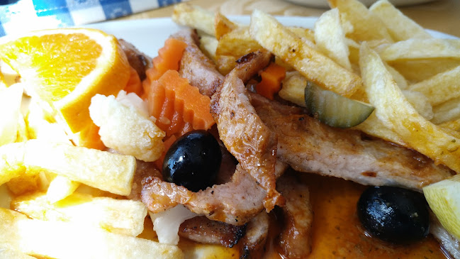 Restaurante serve ao almoço uma diária no valor de 8.50€ que inclui pão, sopa, prato principal, sobremesa, café e bebida. Diversos pratos de peixe e carne. Optamos pelo robalo grelhado na brasa e pelos filetes. Pratos estavam muito saborosos e bem servidos.