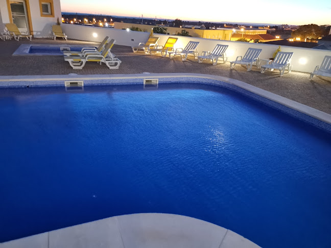 Piscina não muito grande mas com área em redor muito simpática, bar de apoio e belas vistas sobre o Castelo de Alter.